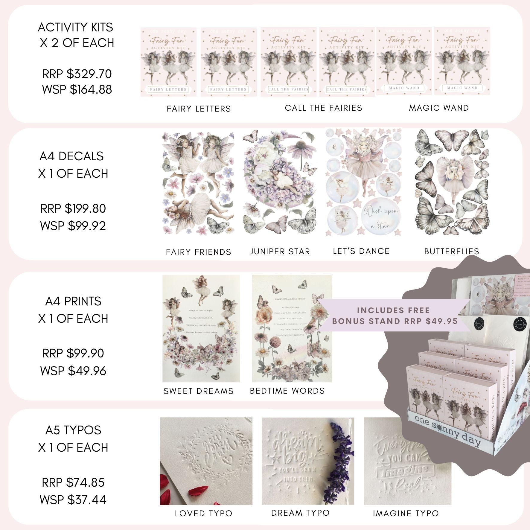 - Includes a custom stand to display instore (RRP $49.95). Follow up orders $100 minimum.